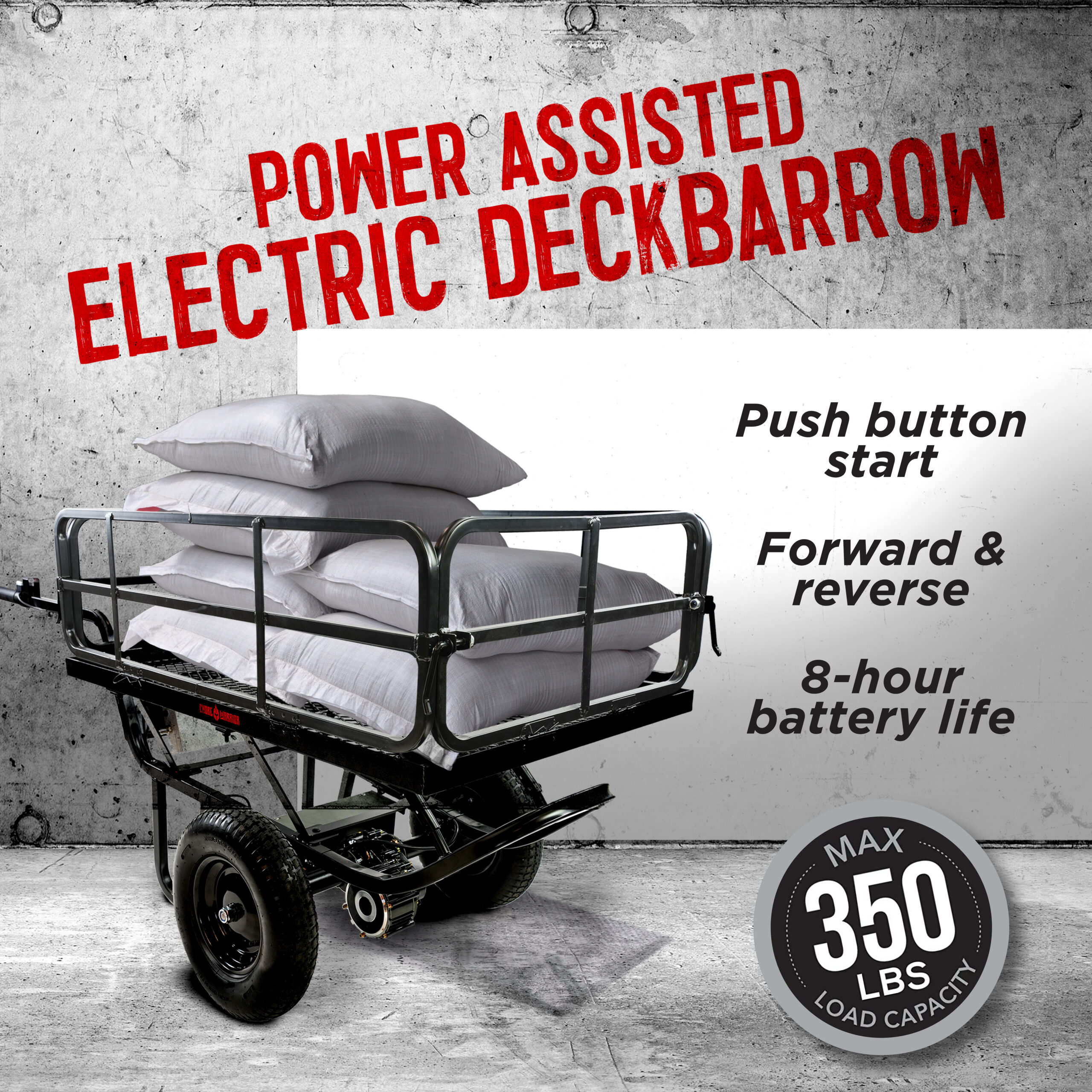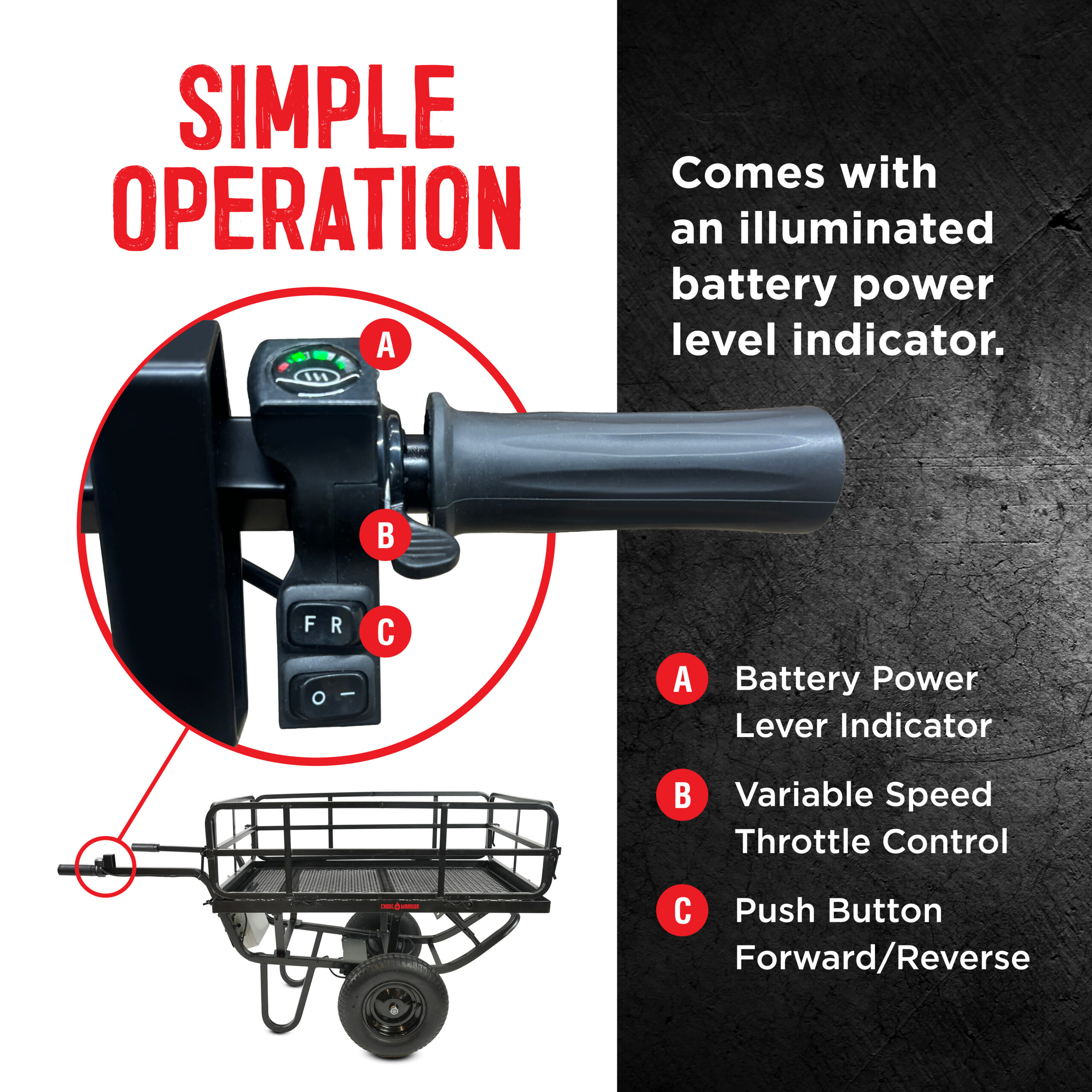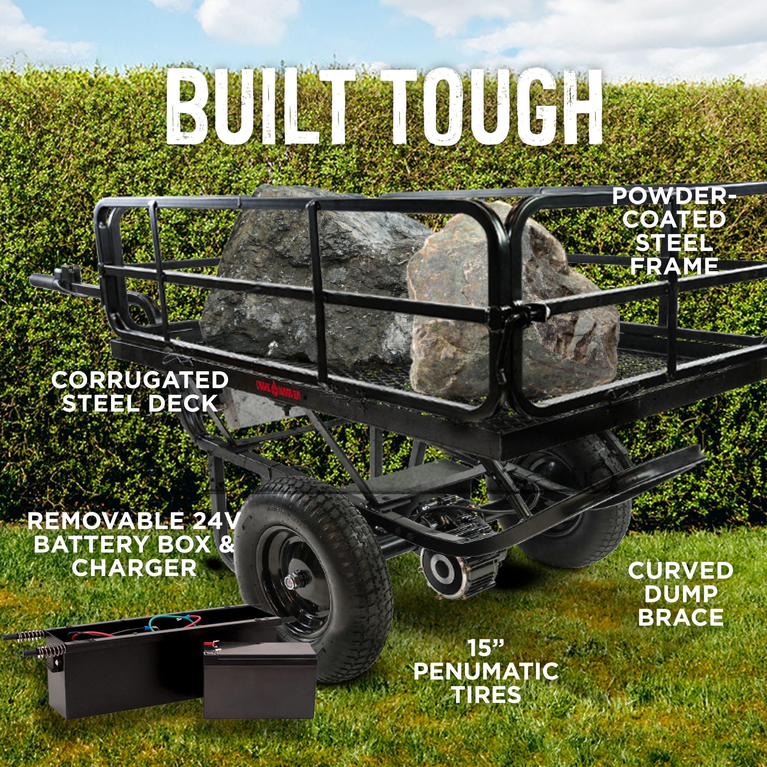 With a powerful 24-volt battery operating system and a 350-pound max load capacity, the Powered Utility Cart is a great tool when you need a tough, flat deck for hauling bulky loads, with sturdy, foldable, collapsible sides to let you pile it on. Its sturdy steel frame is supported with (2) 15″ pneumatic tires. Comes with a battery and charger.