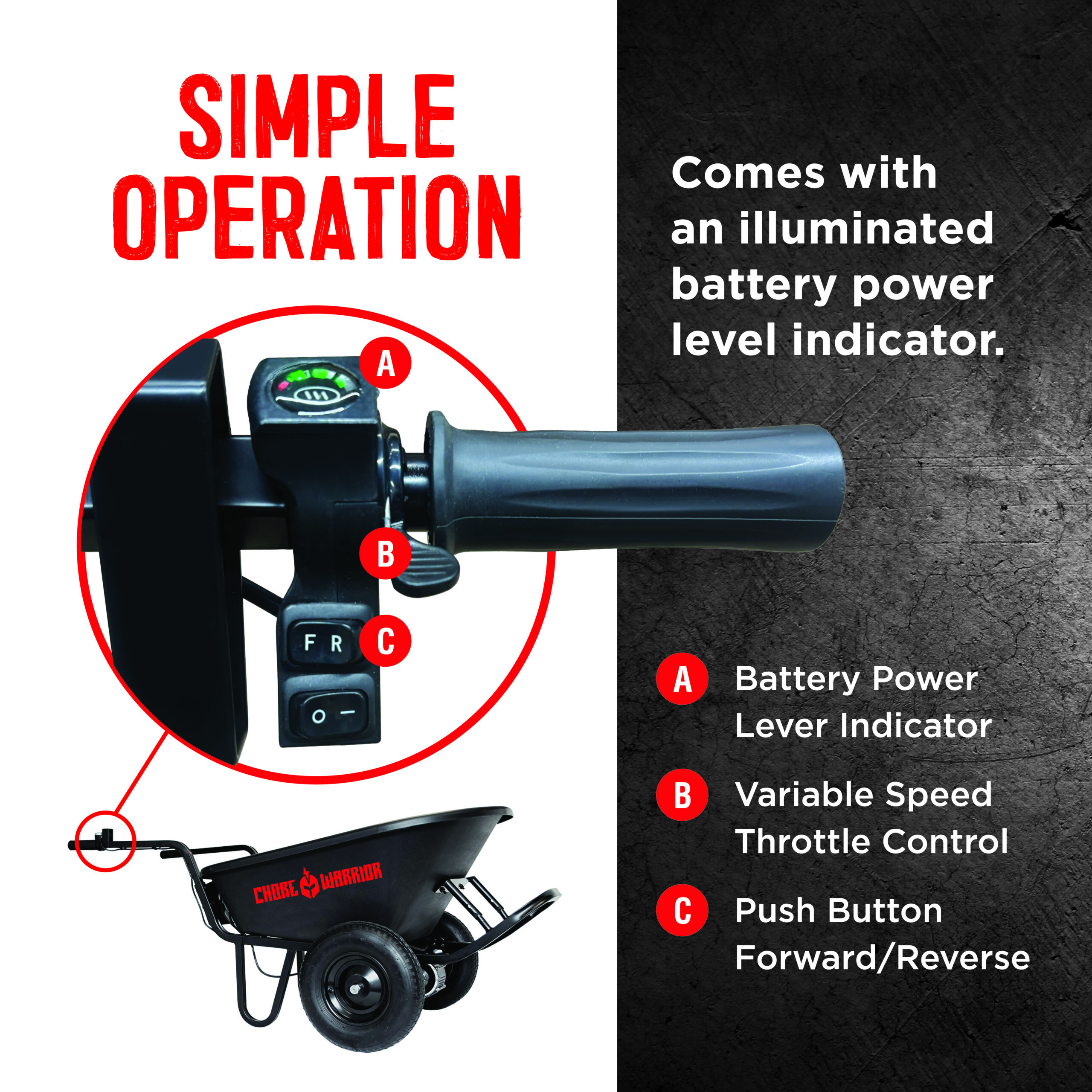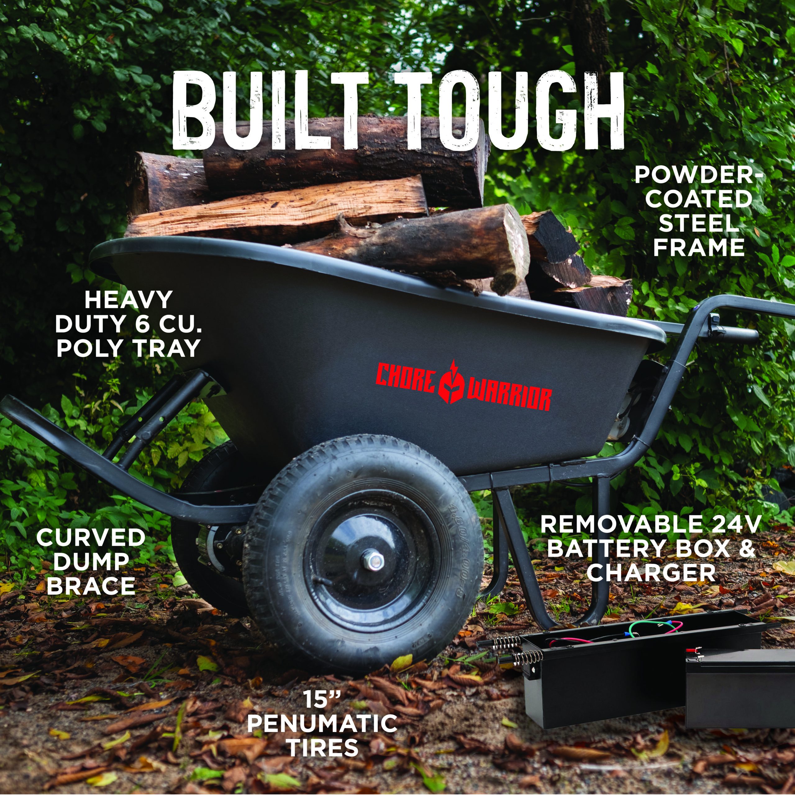 With a powerful 24-volt battery operating system and a 350-pound max load capacity, the CW Wheelbarrow is the perfect workhorse to help with the load-bearing jobs on your to-do list. It’s sturdy steel frame is supported with (2) 15″ pneumatic tires. Comes with a battery, battery charger and 6 cu. ft. capacity poly tray.